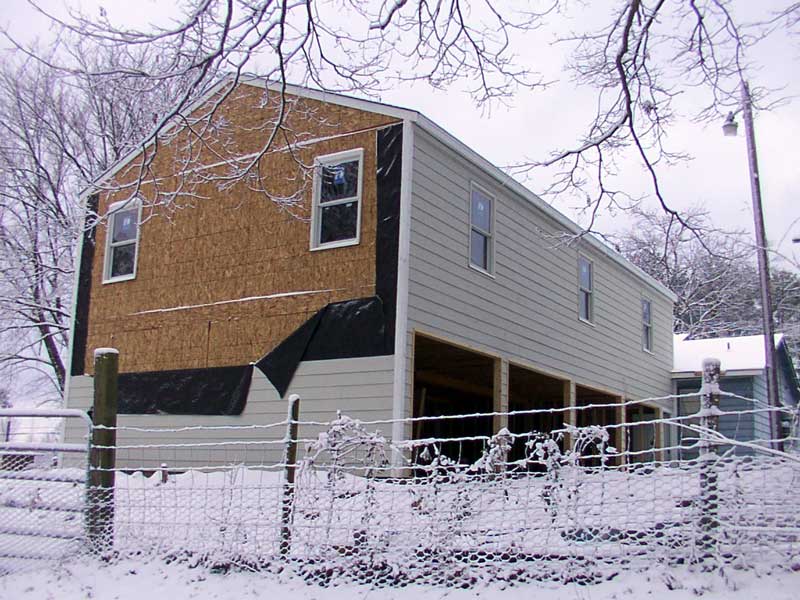 Now that the snow has melted and the weather has cleared up, the workers have made good progress getting the siding up. |